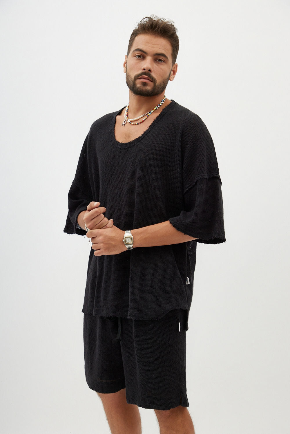 Soft and comfortable knit-textured shorts with a relaxed, raw-edge look.
