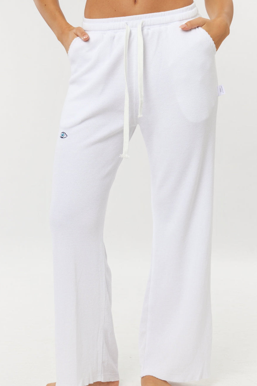 Features: Eye embroidery on the front of the trousers, elastic waistband, and branded drawstring.