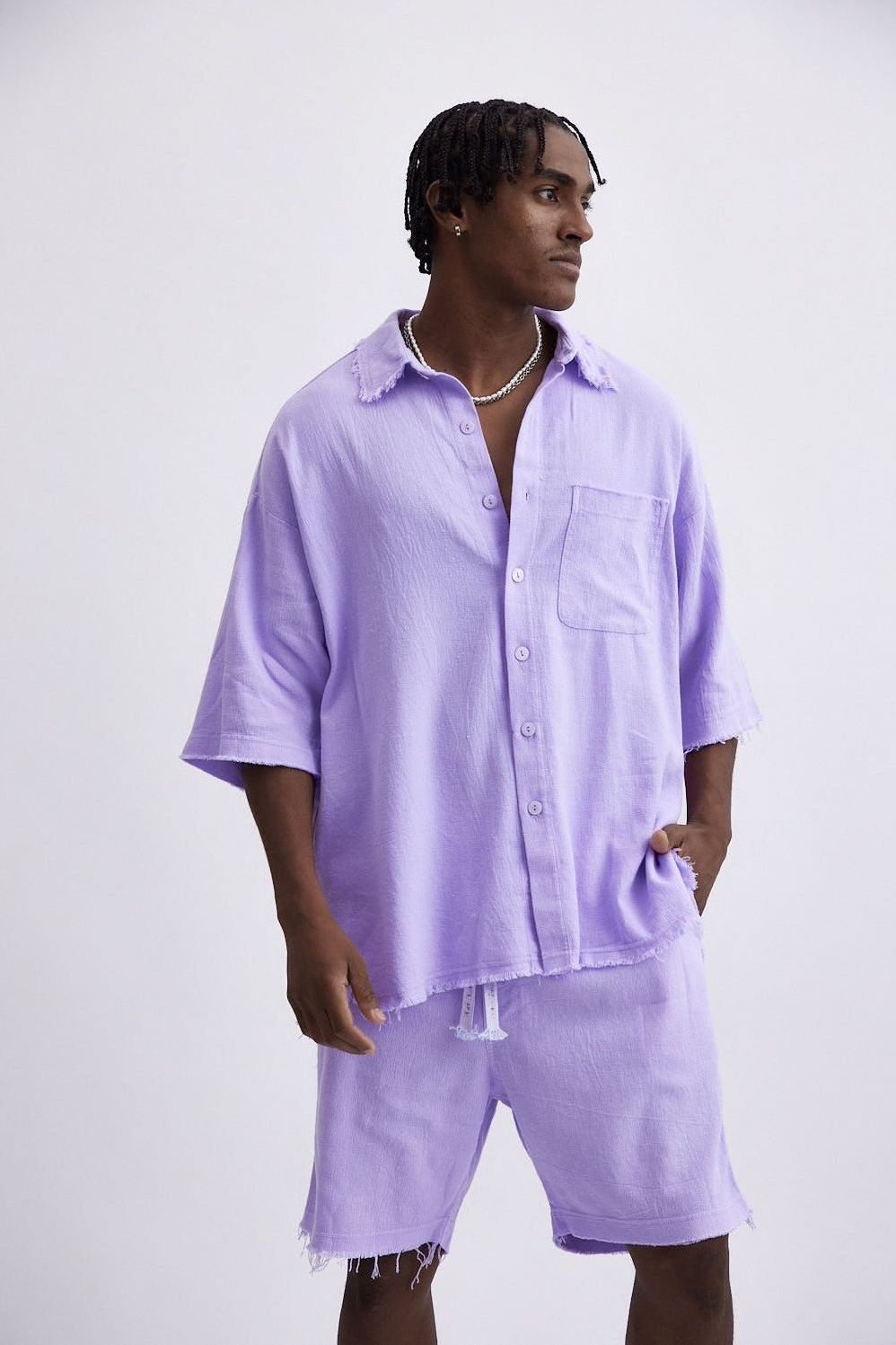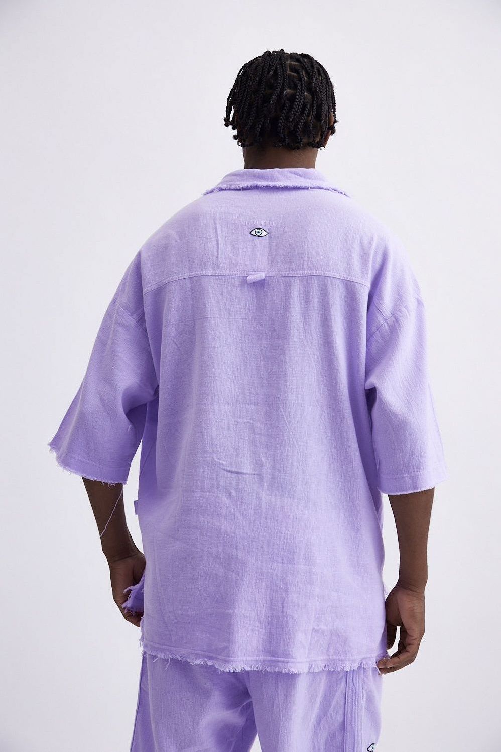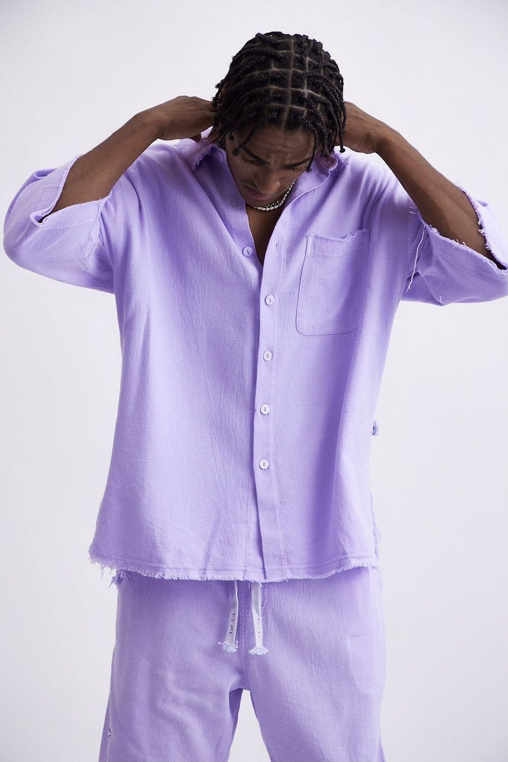 This lilac canvas button-up shirt , short sleeves is crafted from durable fabric, perfect for casual or semi-formal occasions. It features a classic button-up design with long sleeves that can be rolled up for a relaxed look.