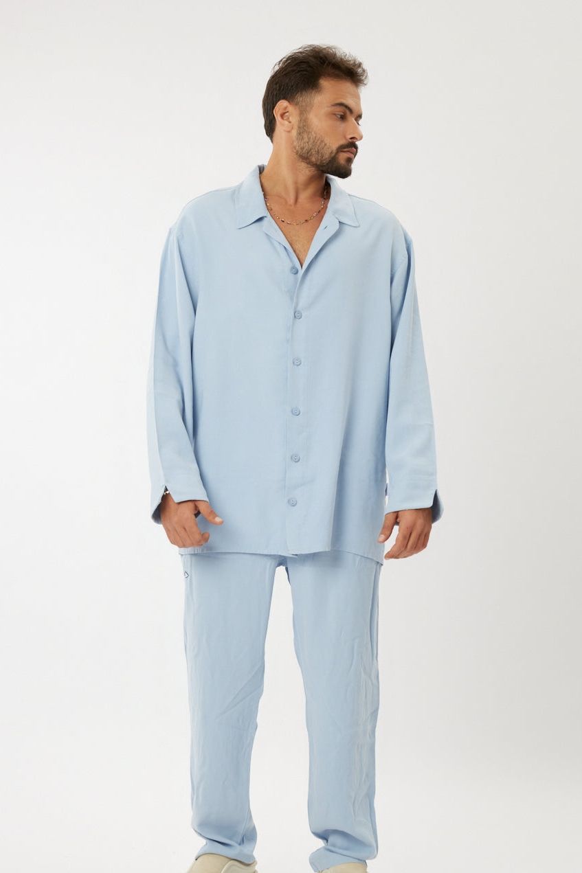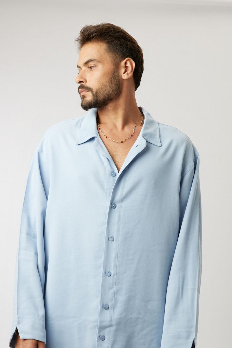 Wide-fit button-down shirt with long sleeves and a slit detail at the cuff.